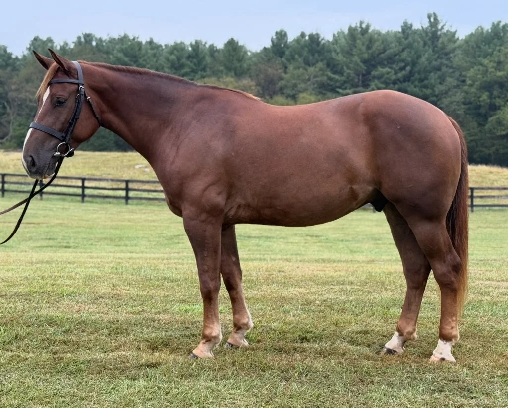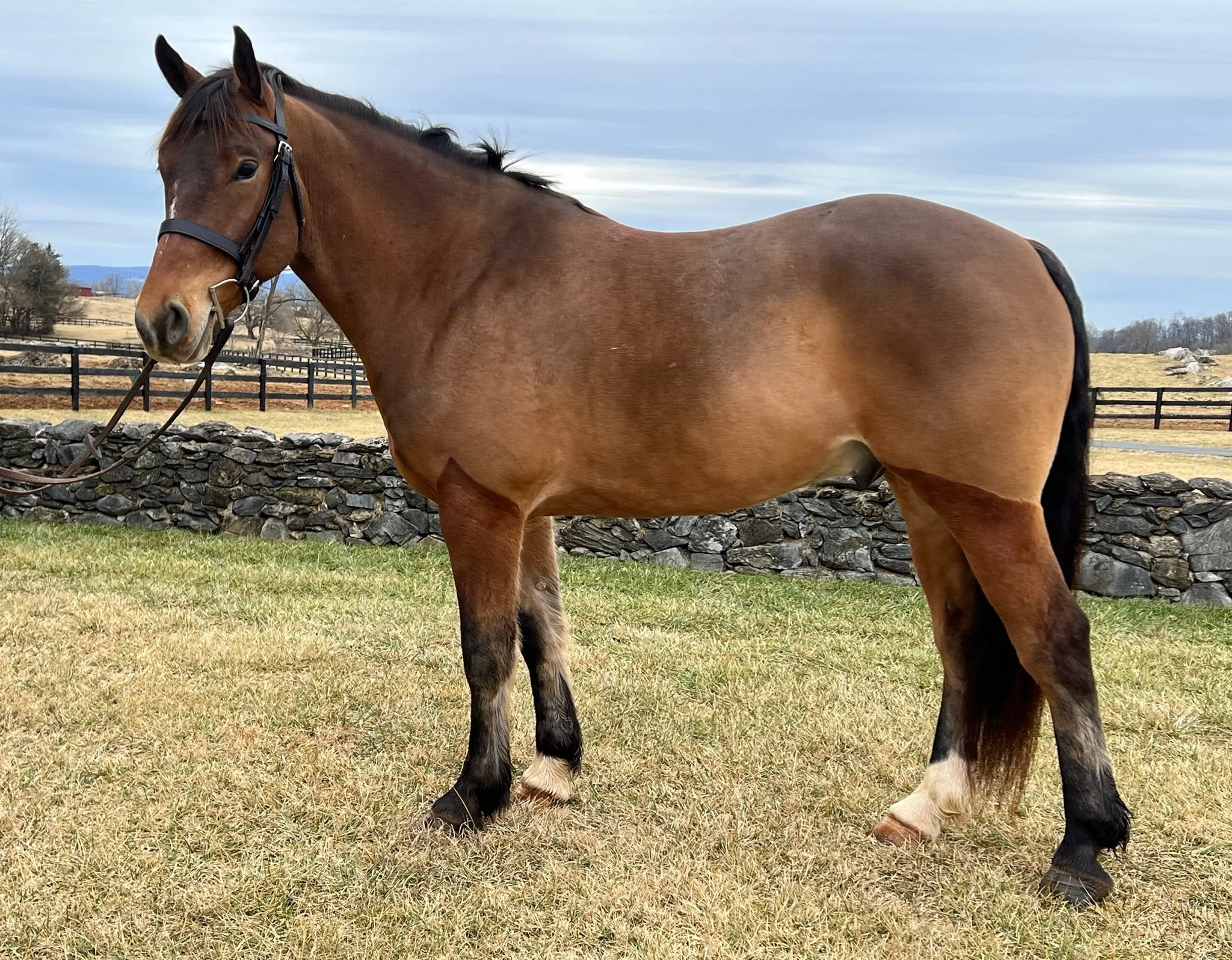 Rio is a Suffolk/QH g. He is handsome, lovely conformation, striking head with a calm and willing temperament! Rio is quiet, reliable and a pleasure to take out on the trail ride whether alone or in company. He confidently crosses creeks, natural obstacles and has hunted lightly the last season and currently hunting this season with Blue Ridge and Piedmont. Rio has proven himself a reliable, steady hunting partner for riders of every level, providing an enjoyable experience in the field. In his previous home he proved to be the ultimate family horse. He was happily allowing the grandchildren to lead him to the fences or hop on him in just a halter and lead rope if necessary. He is also steady and trustworthy enough for the dad or husband to enjoy a lovely ride. Rio offers three smooth comfortable gaits and has been thoughtfully introduced to both show jumps and cross country as well. He has a solid foundation to excel in any direction you choose. This sweet, versatile gelding is looking for his to share a lifetime of fun and adventure. He also has the promise of many years to grow, learn and enjoy together with his new family!